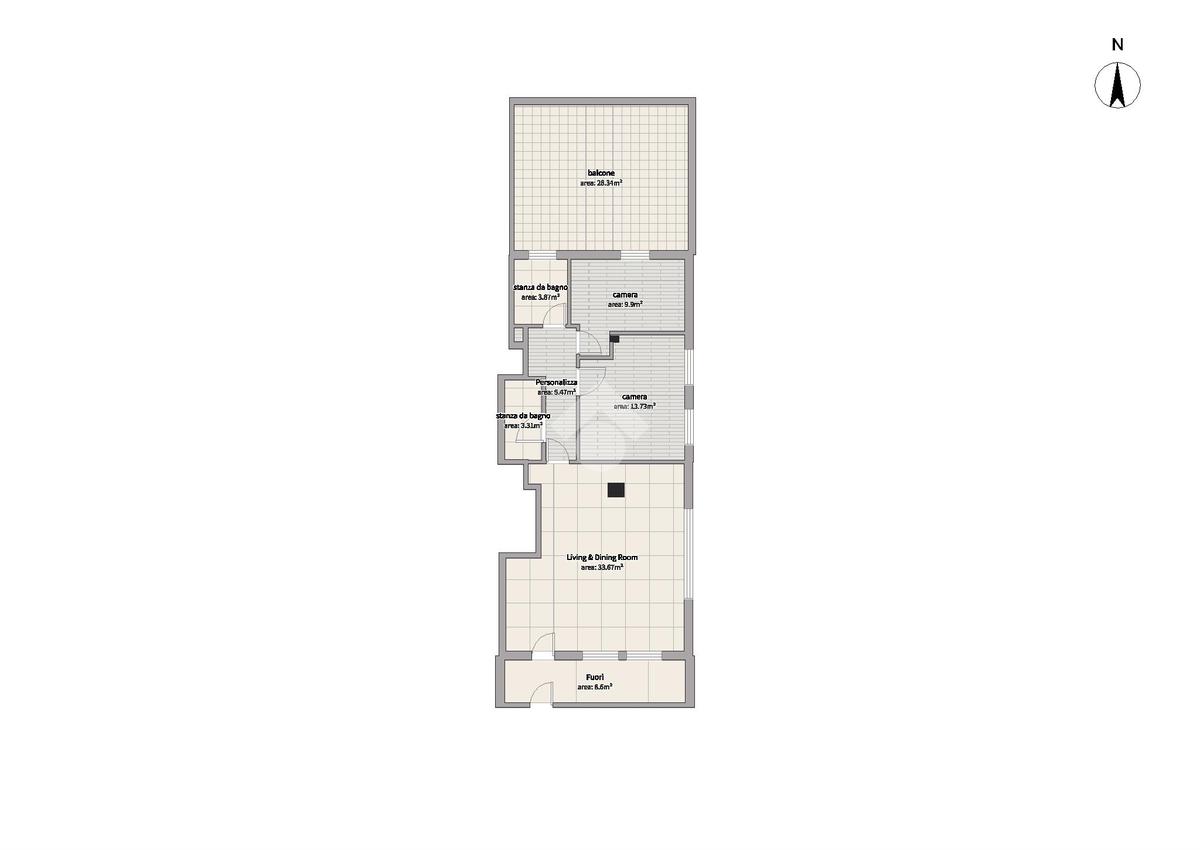L'appartamento si sviluppa in un unico piano, ampio soggiorno in open space di circa 40 mq. La zona notte composta da una camera matrimoniale, una singola e due bagni entrambi con doccia per garantire il massimo del confort. Le finiture interne possono essere personalizzate sulla base del 'Capitolato' esistente. Esternamente la proprietà include ingresso indipendente con scoperto privato, un terrazzo abitabile di circa 30 mq, perfetta per cene all'aperto o semplicemente per godersi il panorama.
